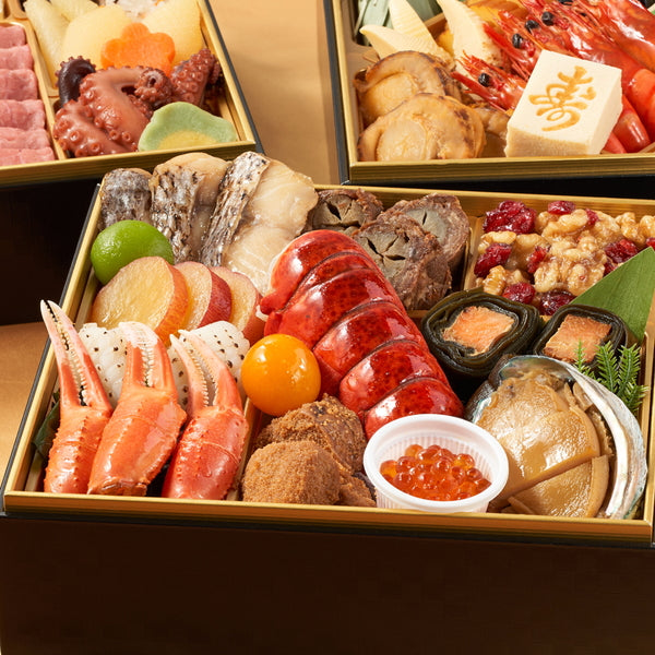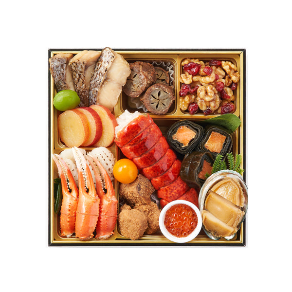 真鯛の幽庵焼, 鳴門金時芋レモン煮, 若桃甘露煮, 松笠いか白焼き, わかめ, かに爪柚庵焼, 牛肉八幡巻, オマール海老, 魚卵甘露煮, きんかんさわやか煮, いくら醤油漬, 紅鮭昆布巻, 鮑煮, クランベリークルミ