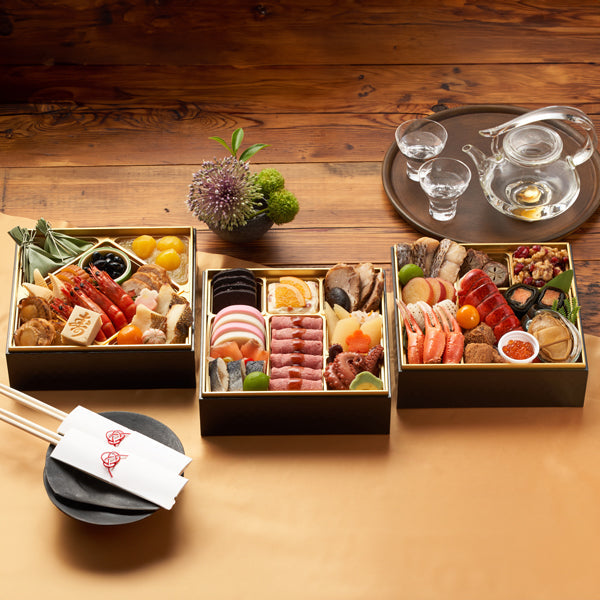 ■あわびや味付オマール海老を盛り込んだ豪華海鮮重など、自宅で本格洋風料理を味わえる和洋折衷3段重。ローストビーフを豪快に盛り付けたお重を中心に、お正月に食べる定番の和風おせち料理を盛り付けたバラエティー豊かなお重です。