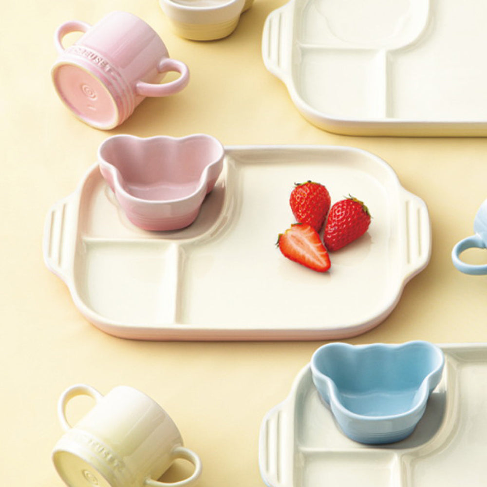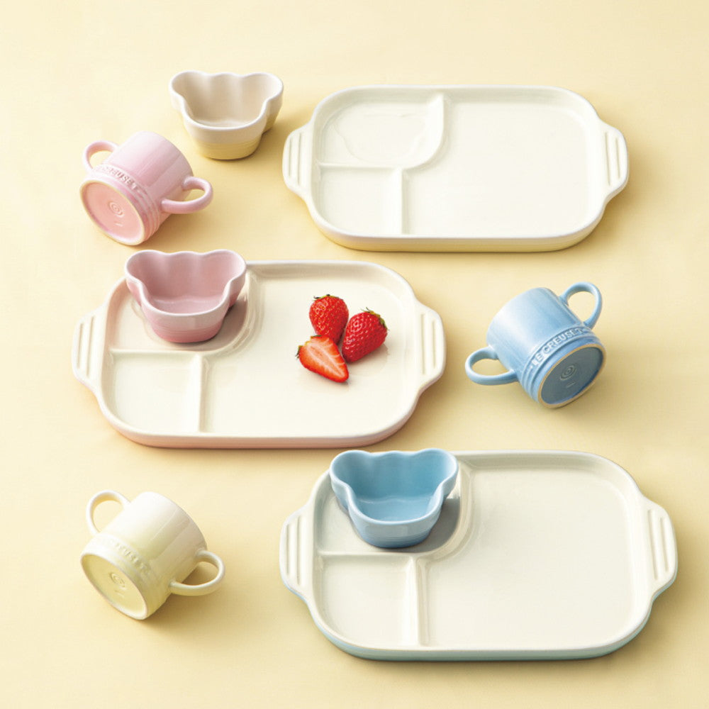 ■ワンプレートで盛り付けができる仕切り付きのお皿です。クマのラムカンは離乳食やデザートの器として、また抜き型としてもお使いいただけます。両脇に持ち手がついた小さなマグカップはお子さまの手にぴったり。