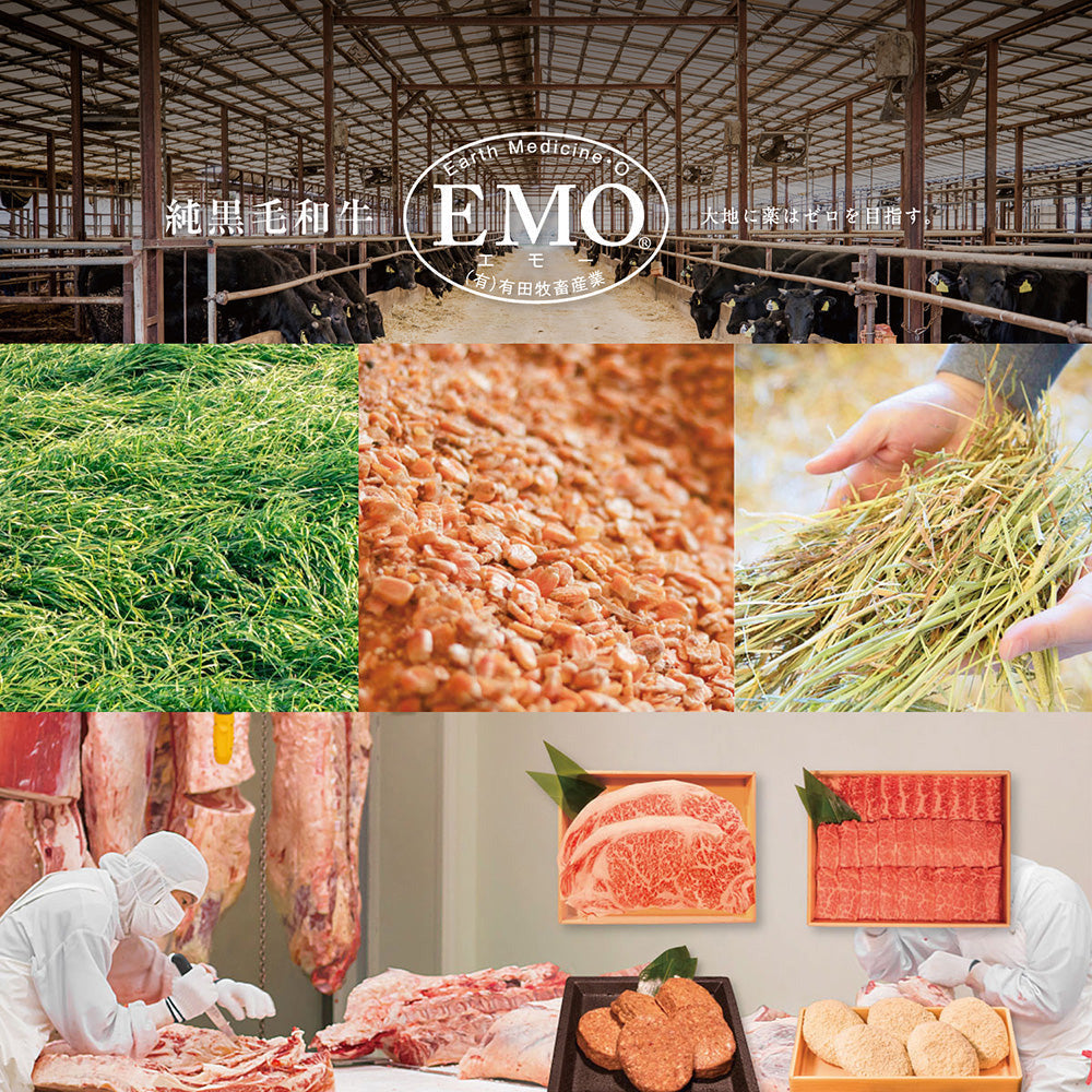 「大地に薬はゼロを目指す」(Earth Medicine 0)の信念のもと、牛にも、エサにも、水にも薬を使わず、丹精込めて育て上げた黒毛和牛です。牛飼い60年以上の知識と経験を十分に活かし、黒毛和牛を約7,000頭肥育しています。適度に日光を浴び、おいしい空気を沢山吸ってストレスフリーな環境で健康な牛が育ちます。また密飼いをせず、1頭1頭しっかり管理を行い仕上げていきます。自社オリジナル配合の飼料を毎日2回お腹いっぱいになるまで与えています。抗生物質は入れておらず人間でも食べられる飼料を与えています。地下81メートルから新鮮できれいな水を汲み上げて牛に与えています。水は内臓にも肉質にも大きく影響しますので常にきれいな水を与えて牛の健康状態を保っています。 ”私たちは健康な牛を育て、健康な牛の肉を食べていただき、健康になって欲しい”というポリシーを常に大切にし、丁寧に肥育しております。(有田牧畜産業HPより)