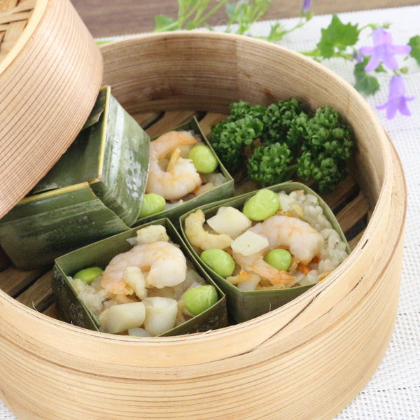 ■海老・いか・イタヤ貝などの海鮮素材がたっぷり入ったおこわのセットです。ココナッツの葉で作った篭に入っていて、目でも舌でも楽しめます。冷蔵庫解凍後に電子レンジで加熱するだけの簡単調理で召し上がれます。
