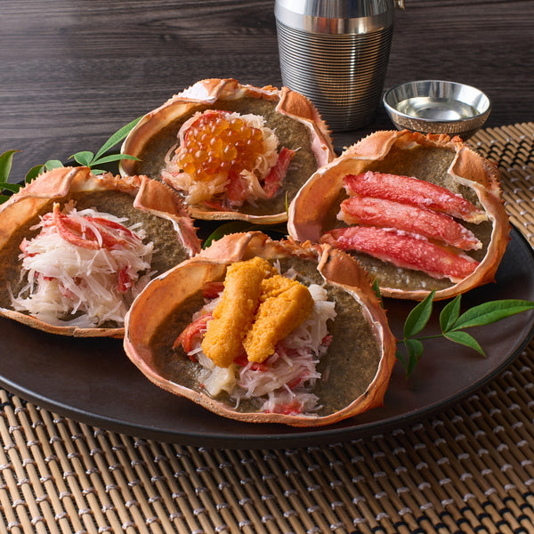 ■商品内容:かにみそ甲羅盛り(かに脚肉のせ2個、かにほぐし身のせ2個、かにほぐし身・いくらのせ1個、かにほぐし身・うにのせ1個)(計6個)