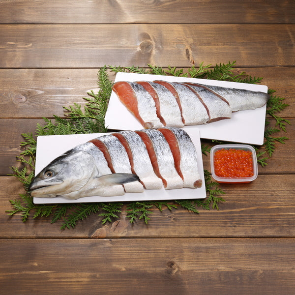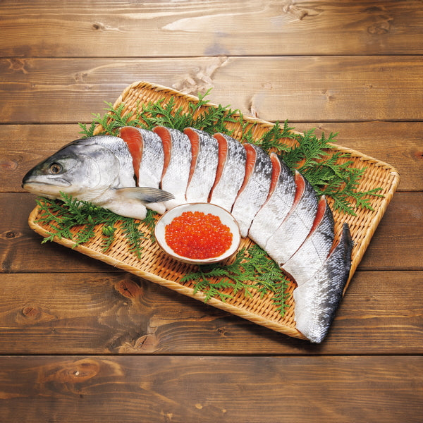 ■9月~11月に北海道沿岸で定置網漁法で水揚げされた秋鮭を厳選し、甘塩に仕上げた銀毛の新巻鮭と、同じく旬に獲ってすぐさま味付けしたいくら醤油漬。鮭は切身にカット済みで、保存に便利な二分割真空状態でお届けします。
