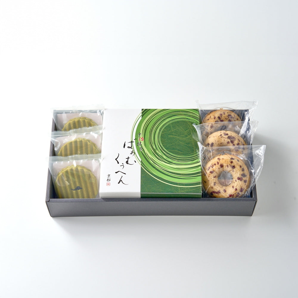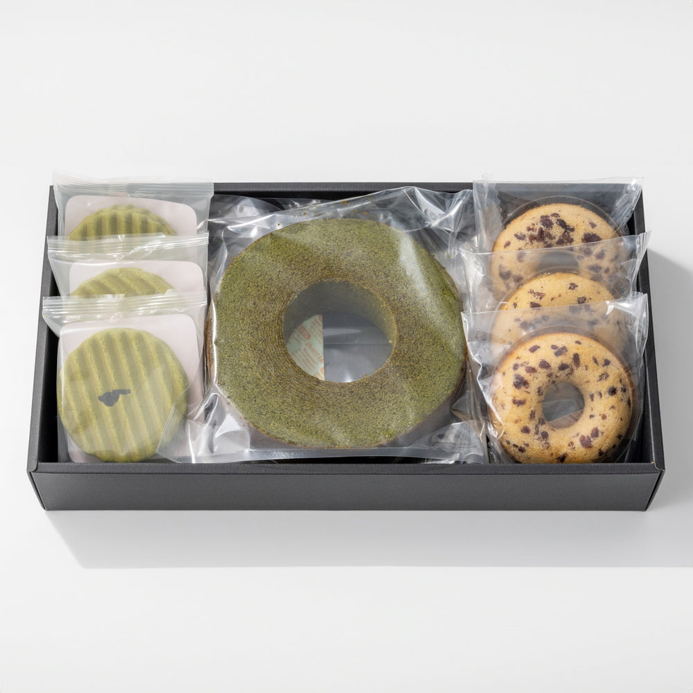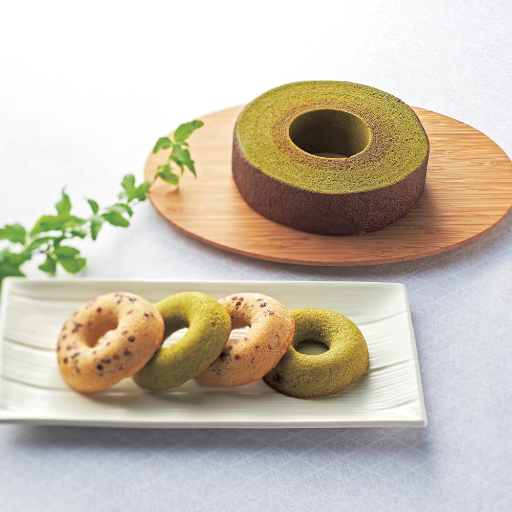 ■元禄年間創業の老舗「丸久小山園」の宇治抹茶を使用した上品で芳醇な香りが広がるバウムクーヘン。優しい甘さの小豆の焼きドーナツに厚みのある波型クッキーに、口どけの良いクリームをサンドしたヴァッフェルもご一緒に。