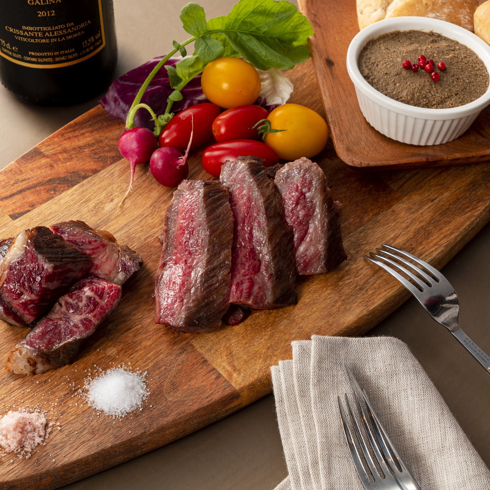 ■専用の熟成庫にて仕込まれた発酵熟成肉は、余分な水分は飛ばしつつ、旨みを湛えた結着水はお肉に閉じ込めることで、4つの特長「テンダネス(やわらかさ)」「フレーバー(特有の芳醇な風味)」「テイスティ(旨み)」「ジューシー(本来の水分)」が味わえ、従来のドライエイジングよりさらに深化しています。黒毛和牛本来の旨みをお楽しみください。岩塩2種と焼き方レシピ付。