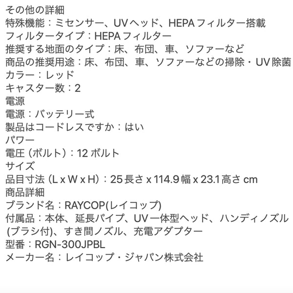 ■商品内容:レイコップ UVコードレススティッククリーナー RAYCOP GENESIS レッド RGN-300
