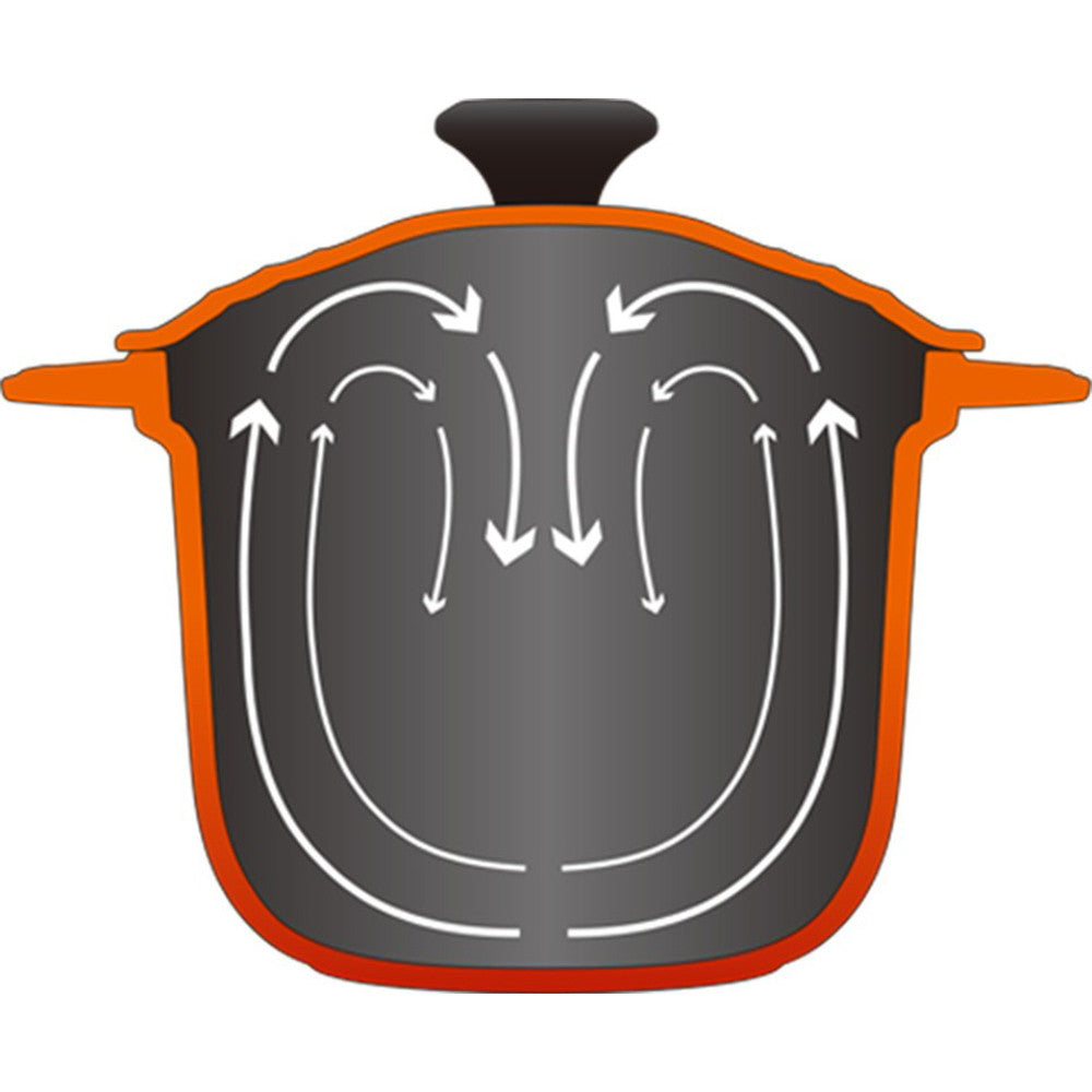 ココット ・ エブリィの最大の特長は、対流を効率的につくる構造にあります。丸みを帯びた底、深さのある本体、そしてドーム型のフタのトリプル効果により、最も効率的に対流が起きる設計になっています。この対流効果によって、素材ひとつひとつに熱が均ーにいきわたり、料理を一層美味しく仕上げてくれます。
