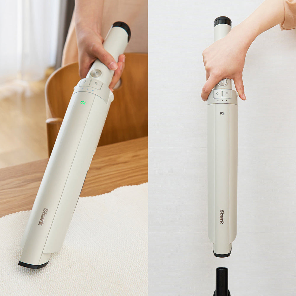 片手でリリースボタンをつまむだけで強力なハンディとして使用できます。掃除中に気になった、家具上や狭い場所のお掃除も、その場でハンディにして使えます。ゴミ捨てもハンディからそのままワンタッチで簡単です。