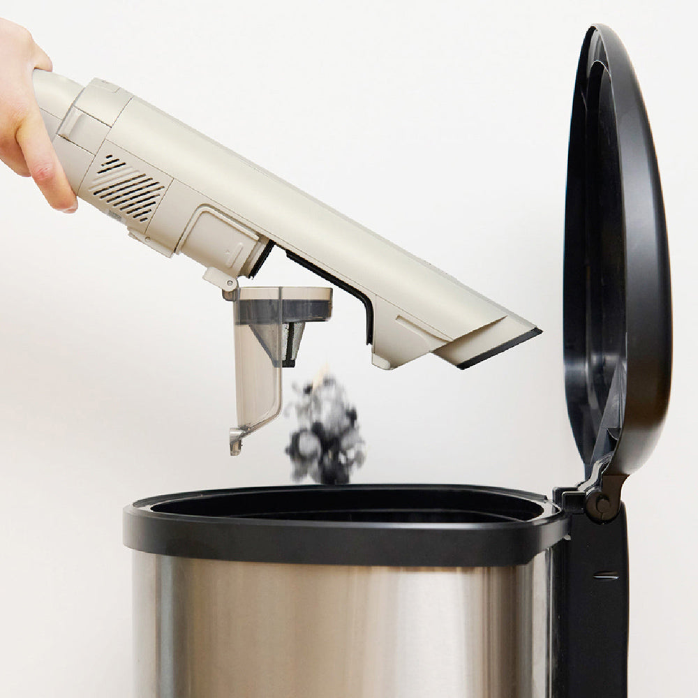 手元のボタンを引くだけでダストカップが開き、ゴミ捨てができます。力を入れることなく、簡単にサッとゴミを捨てられます。