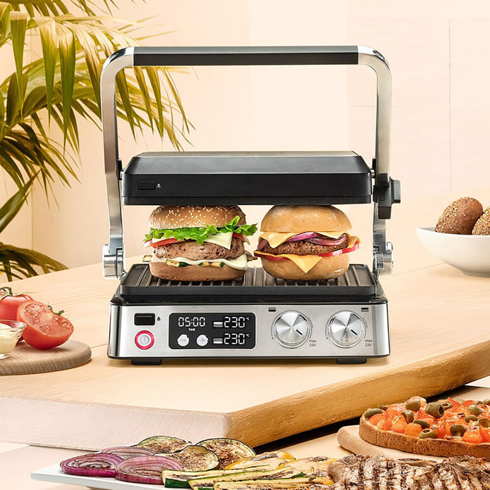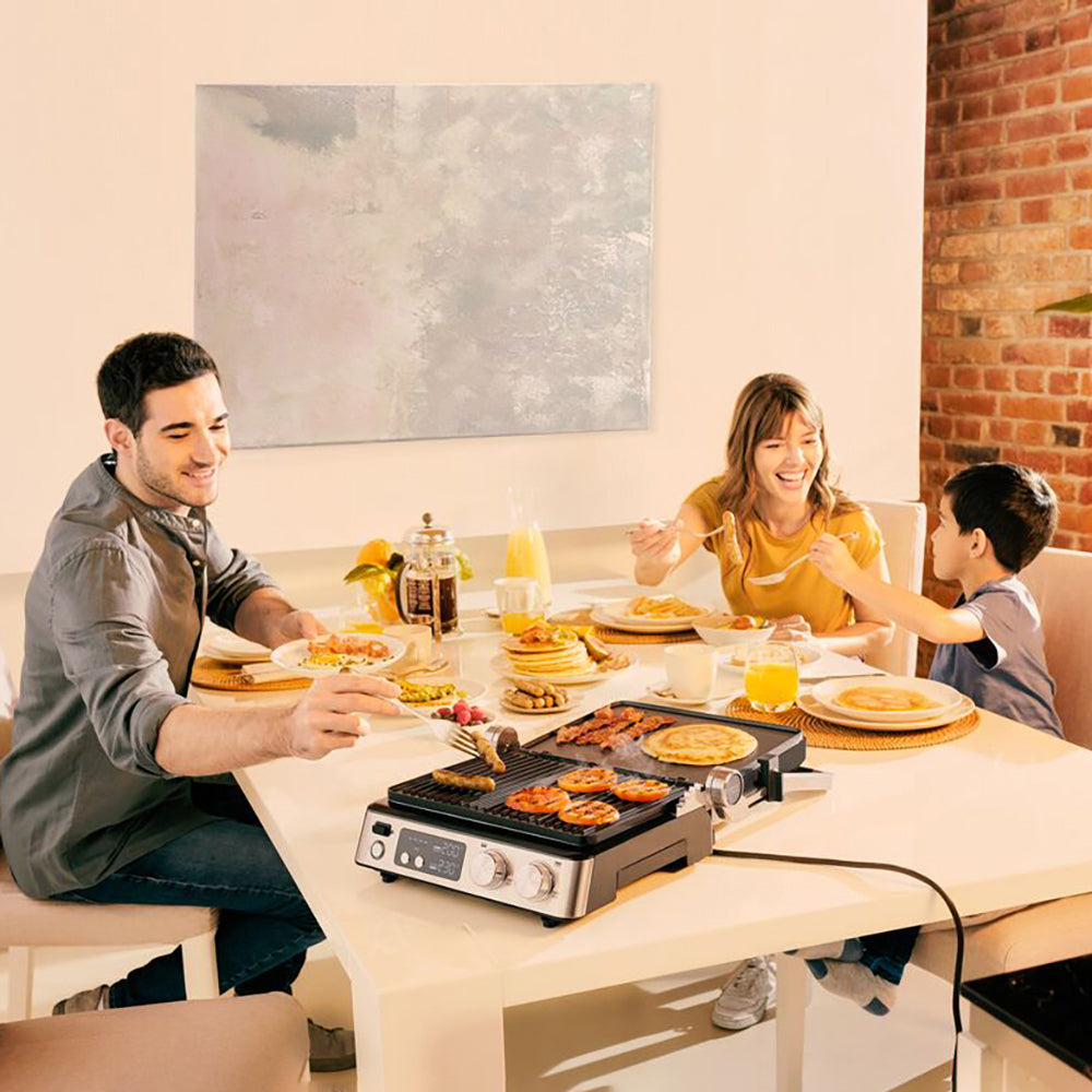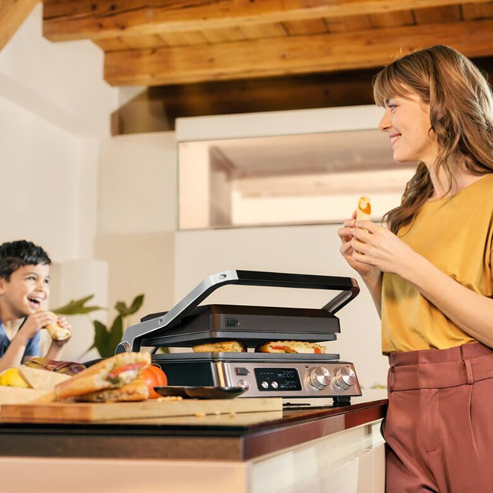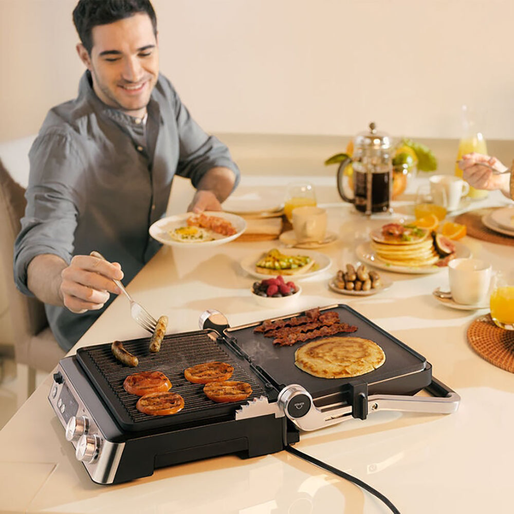■電源はボタン1つ押すだけ、あとは温度をダイヤルで回すだけの簡単操作。 ヒーター内蔵型プレートで立ち上がりも早く、1400Wのハイパワーで素早く均一に加熱できるマルチグリル 7。 忙しい朝はトーストやベーコン、目玉焼きを同時調理、昼はバンズやハンバーグを同時調理し手軽に本格ハンバーガーを。夜は肉や魚、野菜をグリルするだけでお店顔負けの味わいが楽しめます。 余分な脂を落とすトレイや、タイマー機能、そして不使用時は縦置き収納できたりと、毎日の使い勝手も考えられたデザインです。