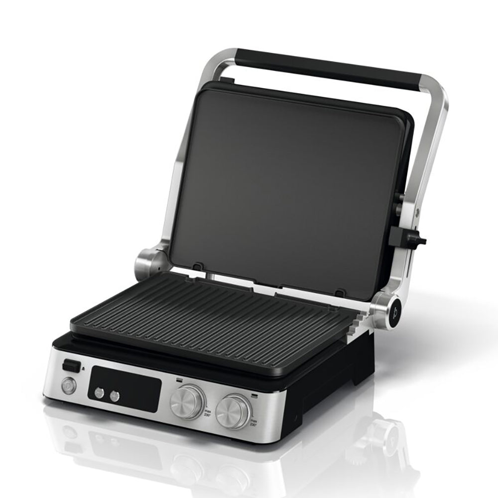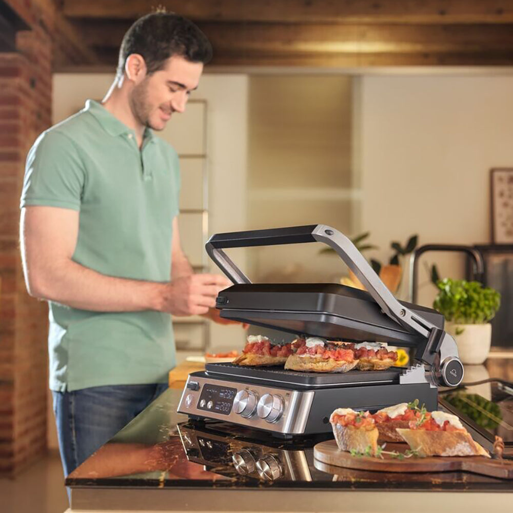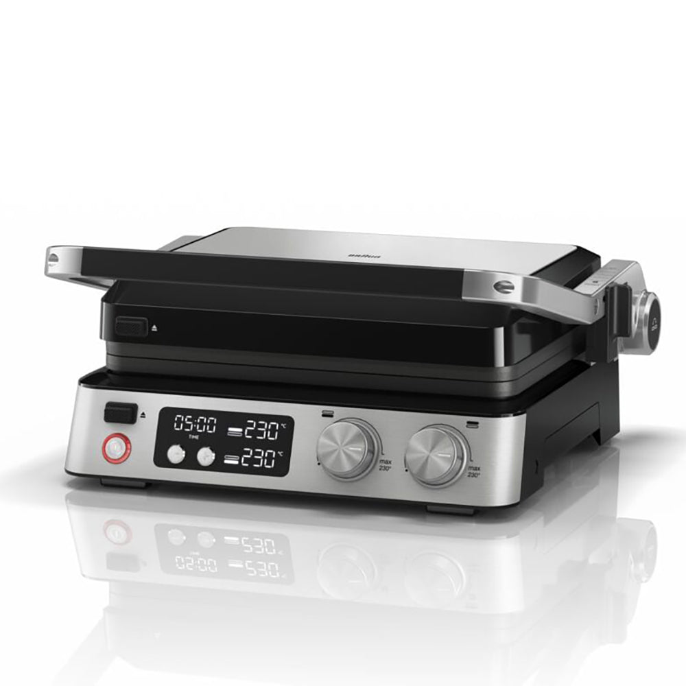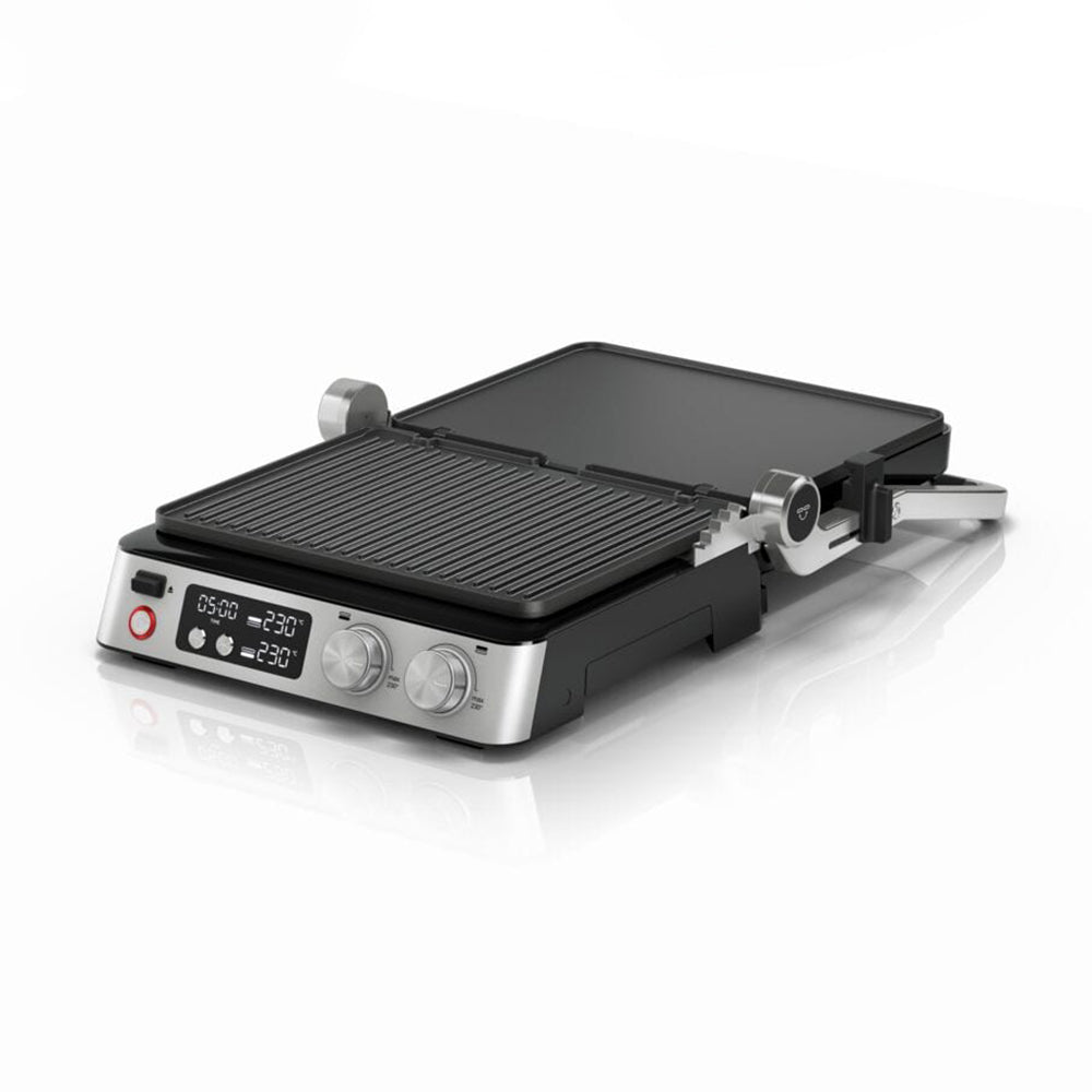 ■電源はボタン1つ押すだけ、あとは温度をダイヤルで回すだけの簡単操作。 ヒーター内蔵型プレートで立ち上がりも早く、1400Wのハイパワーで素早く均一に加熱できるマルチグリル 7。 忙しい朝はトーストやベーコン、目玉焼きを同時調理、昼はバンズやハンバーグを同時調理し手軽に本格ハンバーガーを。夜は肉や魚、野菜をグリルするだけでお店顔負けの味わいが楽しめます。 余分な脂を落とすトレイや、タイマー機能、そして不使用時は縦置き収納できたりと、毎日の使い勝手も考えられたデザインです。