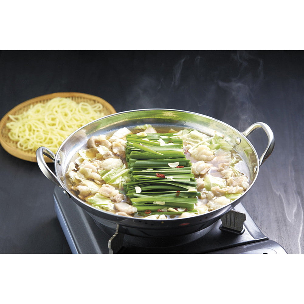 博多の美味を代表するひとつの『もつ鍋』。牛もつはもちろん国内産を使用。キャベツ、ニラなどたっぷり入れて食べたあと、うれしい『しめ』のちゃんぽん麺付き。