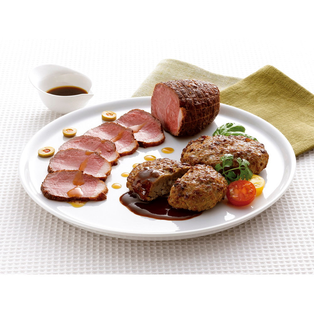 北海道産牛のモモ肉をスパイスと赤ワインにじっくり漬け込みしっかり味をなじませたローストビーフと、北海道産牛100%のビーフハンバーグのセットです。低温真空調理でじっくりと柔らかく仕上げました。
