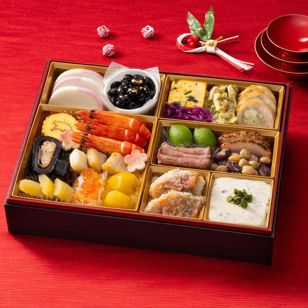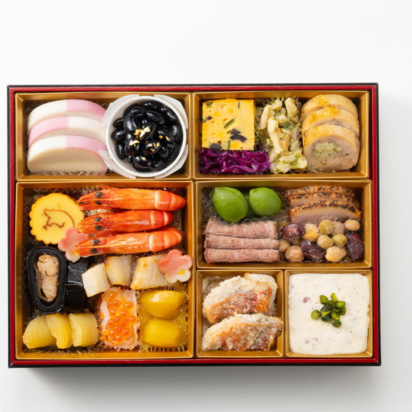 ■世界の賓客をおもてなしする日本の高質ホテルの代表格「ホテルオークラ」。ホテルオークラで提供されるサービスやお料理は世界のVIPからも評価が高く国内・海外からも多くの客でにぎわう伝統あるホテルである。オーナーシェフが吟味した品目を華やかに盛り付けました。カラスガレイの西京焼き、フルーツチーズピスタチオなど、和洋バラエティに富んだおせちです。