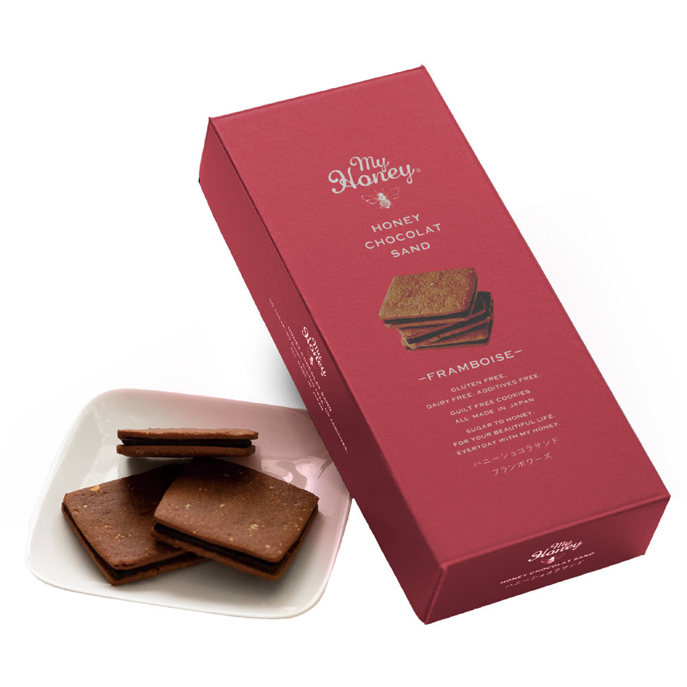 ■東京・表参道に本店を構える、はちみつ専門店MY HONEYのギフトセットです。甘さははちみつだけ。1枚ずつ手作りで仕上げた罪悪感のないショコラサンドです。一口食べると、フランボワーズのやさしい甘さとフルーティーな酸味に出会い、噛みしめるごとにカカオとフランボワーズの魔法がお口の中で絶妙に広がります。