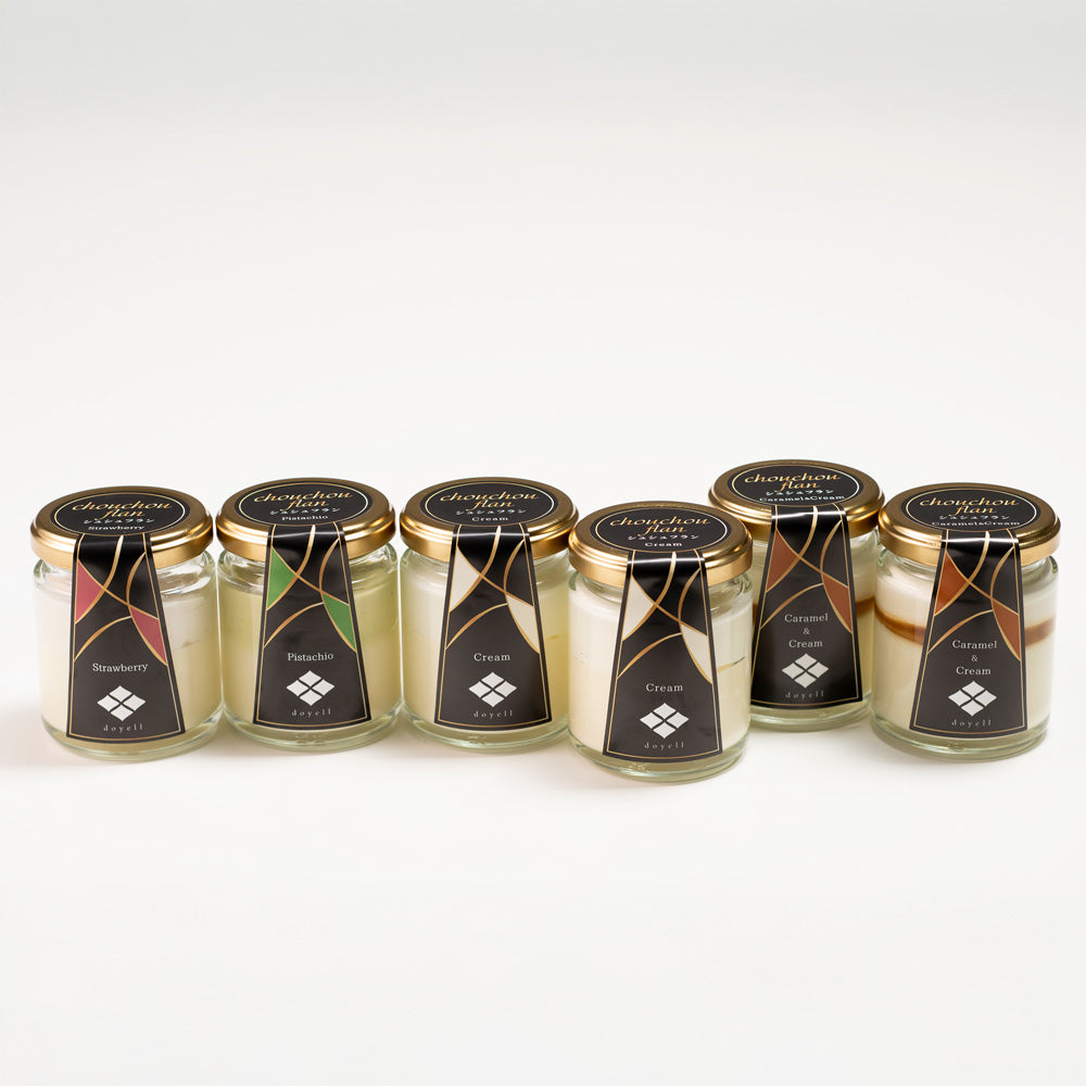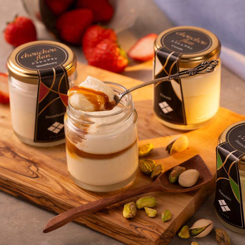 ■お気に入りのスイーツという意味からchouchouflan(シュシュフラン)と名付けたプリン。なめらかな食感、卵のコクとミルクのやさしい甘さにこだわったプリンに4種類のクリームをトッピングしたパティシエ渾身の自信作です。夕暮れの帰り道、お気に入りのスイーツが待っているしあわせな時間をプリンとともにお届けします。
