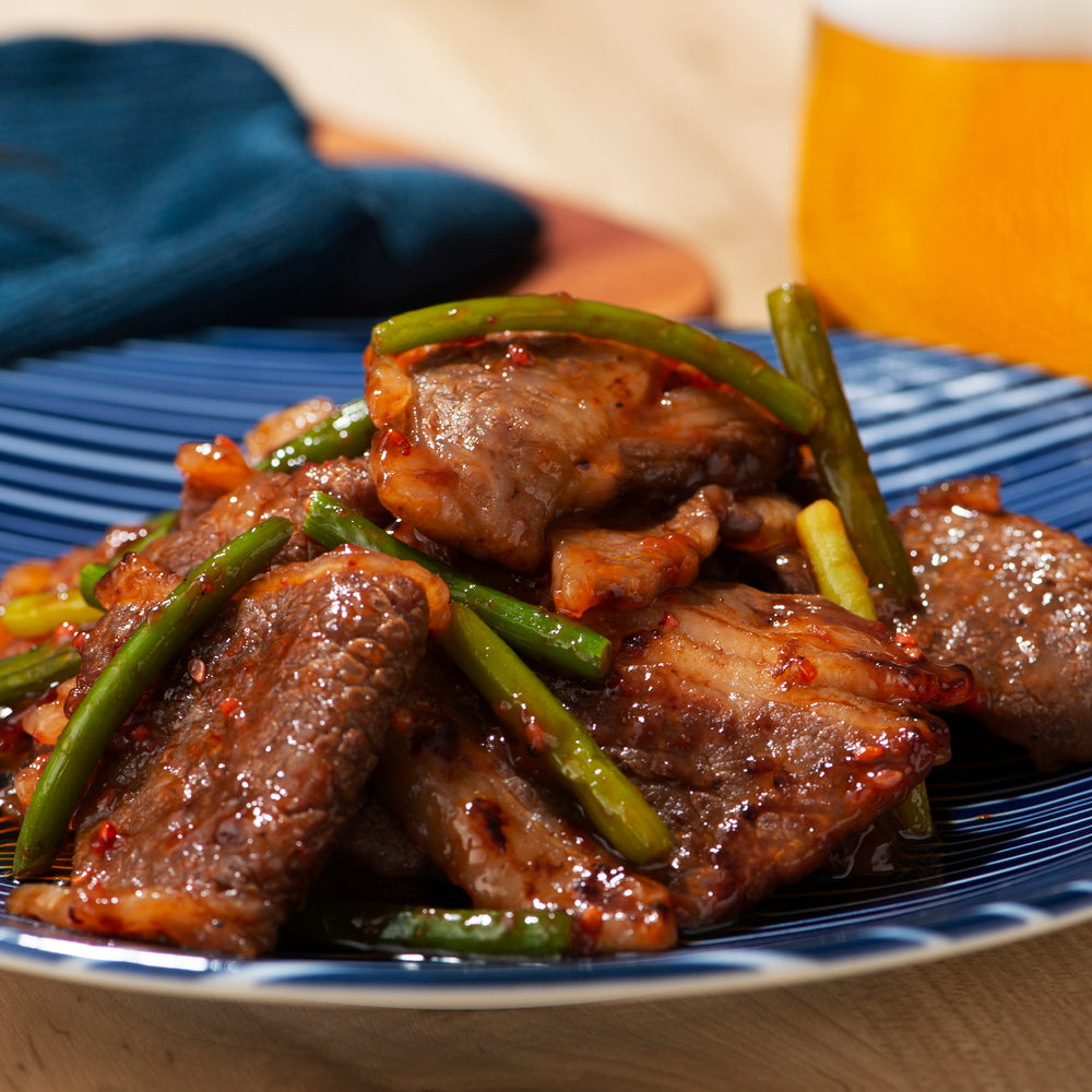 ■黒毛和牛の専門店「フジチク」の独自ブランド黒毛和牛「藤彩牛」。赤身とサシのバランスが良く、柔らかい肉質が特徴です。焼肉用として人気NO.1のお肉のカルビ(バラ肉)。焼くと溢れ出す肉汁とその香りが食欲をそそります。サシに甘みもあり肉の旨みを引き立てます。そのお肉を職人が丁寧に焼肉用にカットしました。