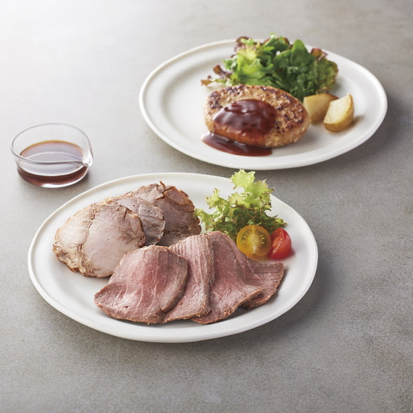 素材の味を活かして丁寧に焼き上げたローストビーフと、宮崎県産の豚肉を使用して焼き上げた焼豚と、国産の豚肉を使用したポークハンバーグです。(豚ハンバーグ)焼いてお召し上がりください。