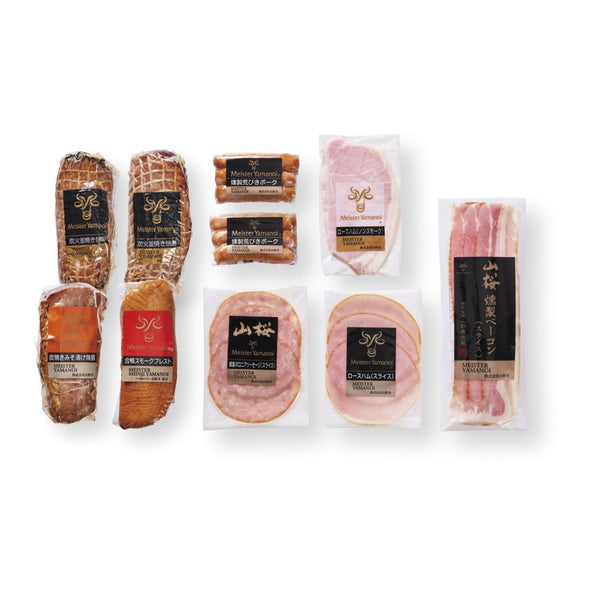 ■商品内容:炭火釜焼き焼豚×2(合計360g)、燻製荒びきポーク×2(合計90g)、炭焼きみそ漬け焼豚180g・合鴨スモークブレスト(タイ製造)130g・ロースハム(ノンスモーク)60g・山桜燻製ボロニアソーセージ(スライス)40g・ロースハム(スライス)40g・山桜燻製ベーコン(スライス)45g各1