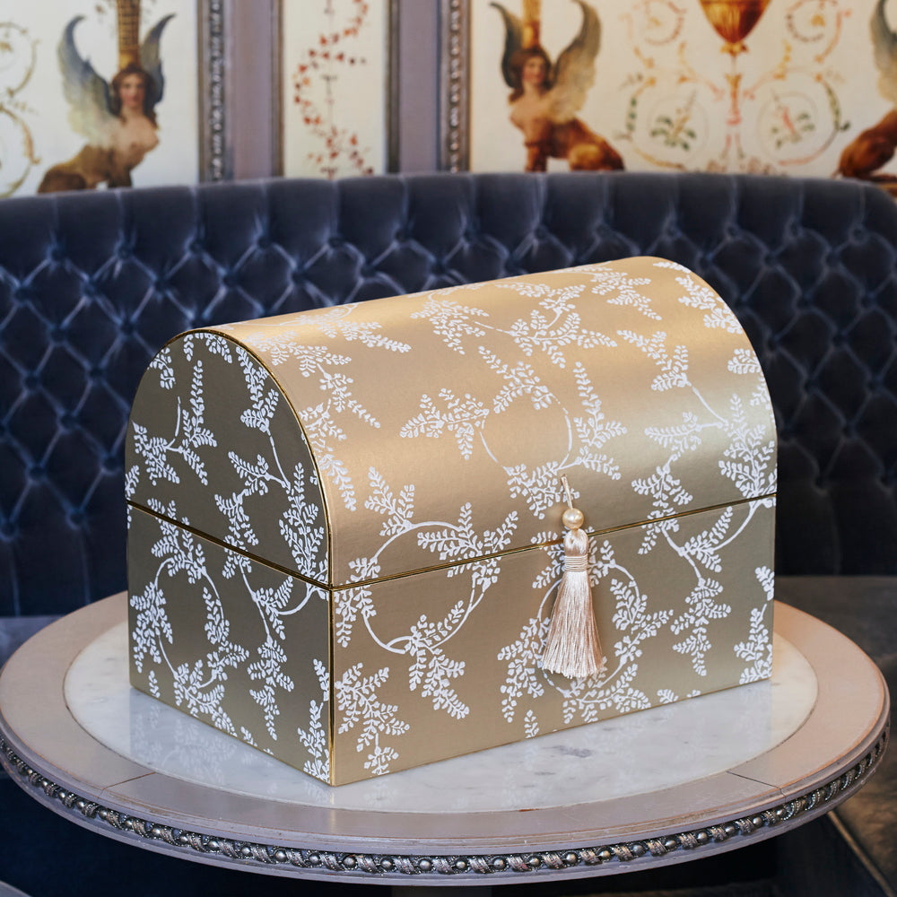 トトアキヒコ氏のブランド「雲母唐長」が成長と繁栄のメッセージを込めて「信夫の丸(しのぶのまる)」の文様で装飾し18世紀の板木から生まれた本物の唐紙によって作られたこの上なく優美なトレジャーボックス。