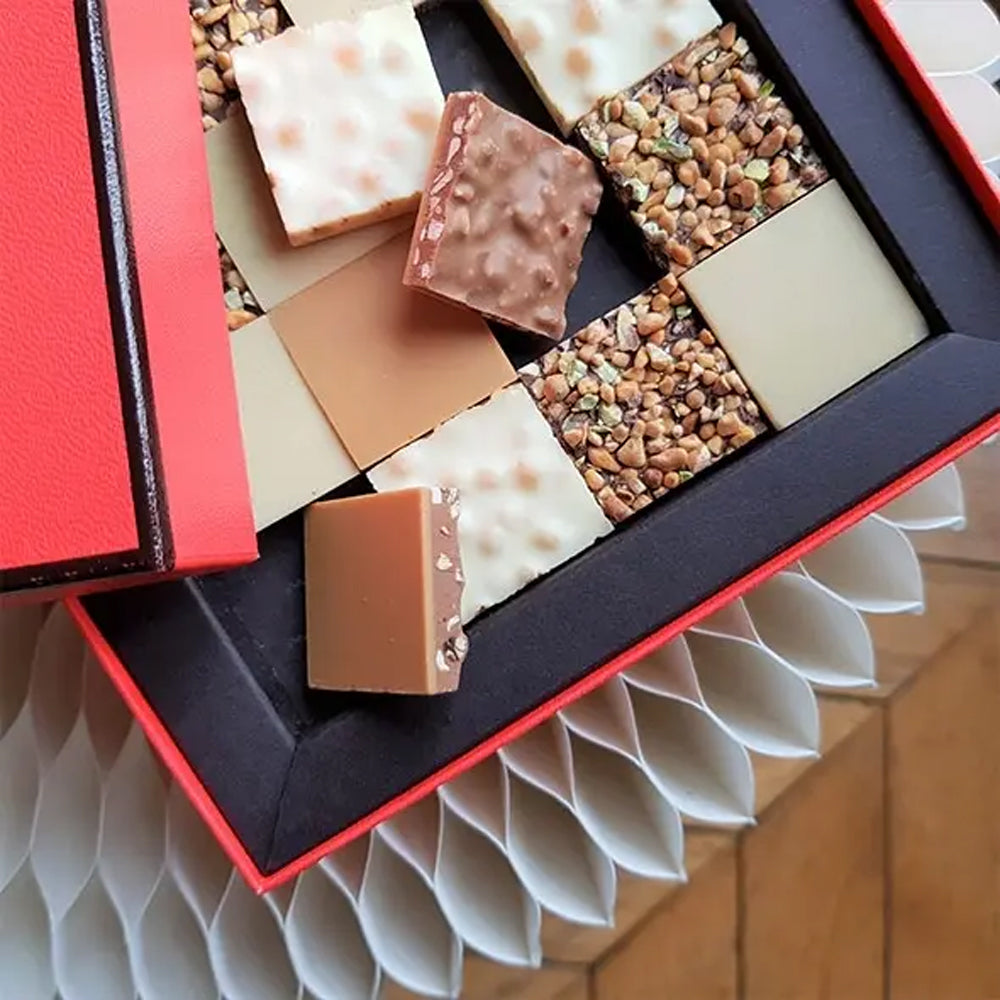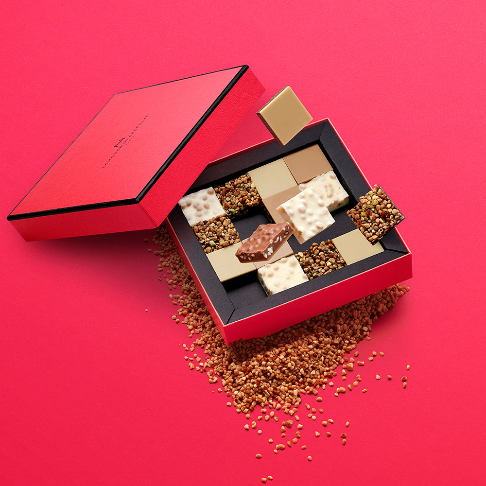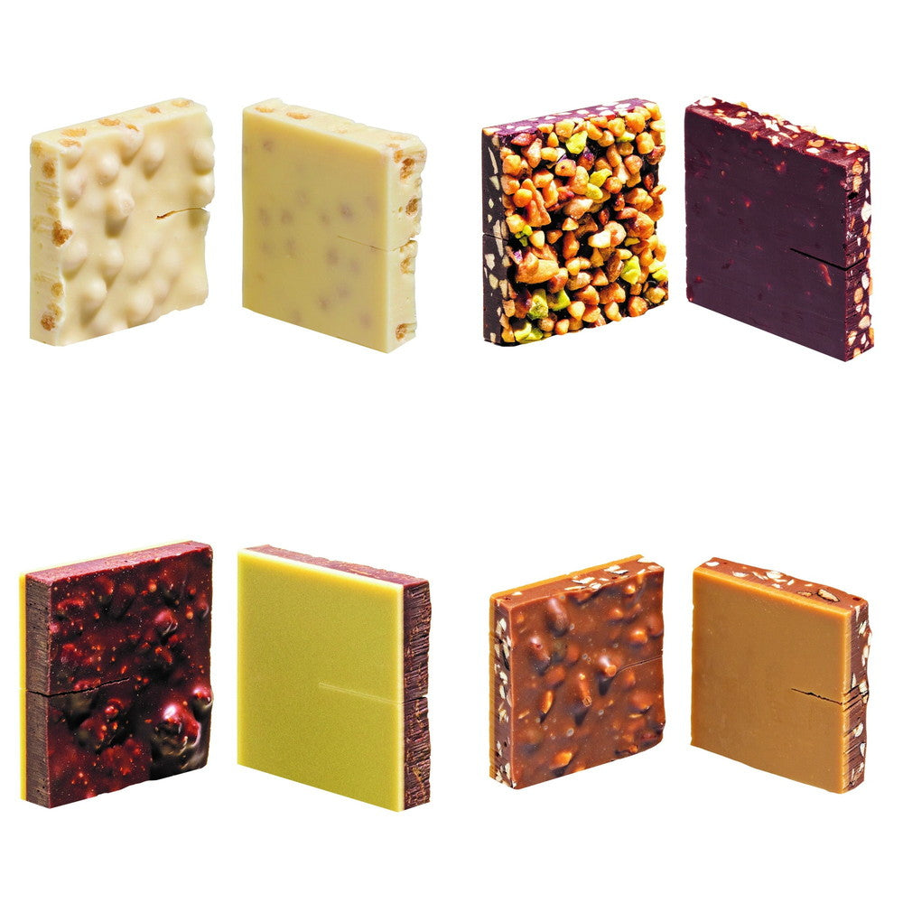 ペカン ブロンディネ、キャヴァル フリュイ セック、パッション ヴィブラント、ブラン フリソナンの4種のタブレットを正方形にカットしボックスに詰合せました。