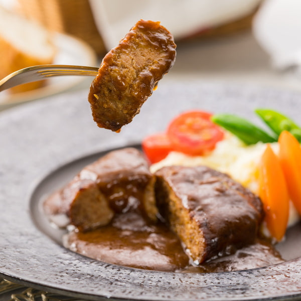 赤ワインとトマト、バターで奥深い味わいに仕上げたデミグラスソースに、温めたときにジューシーさが残るよう軽く焦げ目をつけて焼いたハンバーグを閉じ込めました。レンジアップでお召し上がりいただけます。