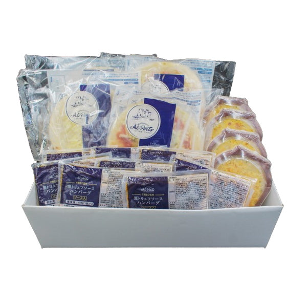■商品内容:アルポルト スペシャルグルメセット 黒トリュフソースハンバーグ150g×8・ポテトグラタ200g×4、マルゲリータピッツァ210g・黒トリュフと5種チーズのピッツァ185g×各2