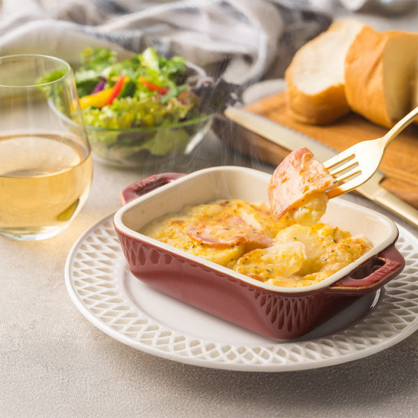 ■5種類のチーズを贅沢に使用し、濃厚でクリーミーなベシャメルソースと、ホクホクのポテトが絡み合う逸品。焼き色が付いたチーズとベーコンの香ばしさが食欲をそそります。電子レンジで温めるだけで、本格グラタンをご家庭で簡単にお召し上がりください。