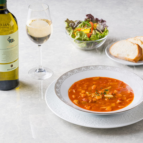 キャベツ、玉ねぎ、じゃがいも、にんじん、ピーマンなど複数のお野菜とベーコンを、トマト ピューレで煮込んだスープの定番ミネストローネは、 白いんげん豆を加えてコクのあるお味。