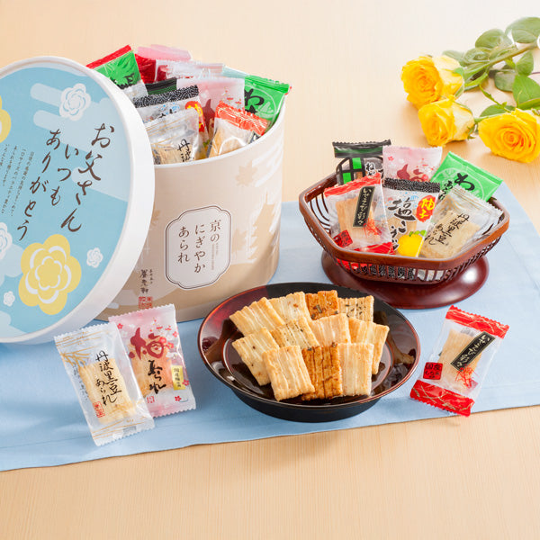■感謝の気持ちが伝わる可愛いパッケージに、色んな味のあられをいっぱい詰め込みました。ご家族やご友人で楽しめる、にぎやかなギフトです。父の日のメッセージをつけてお届けいたします。
