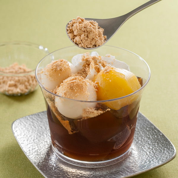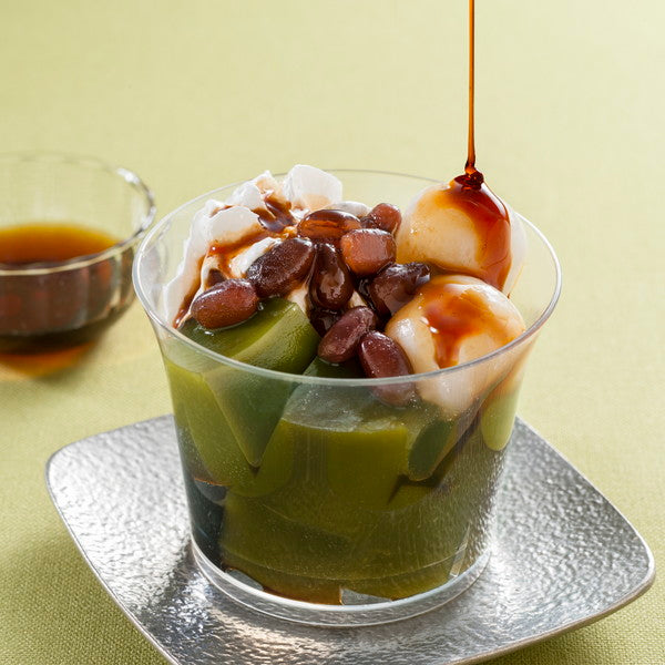 ■黒糖と抹茶2種類のわらび餅に白玉・ホイップクリームなどをトッピングしたひんやり和スイーツ。仕上げに、黒糖わらびにはきな粉を、抹茶わらびには黒蜜をかけてお召し上がりください。