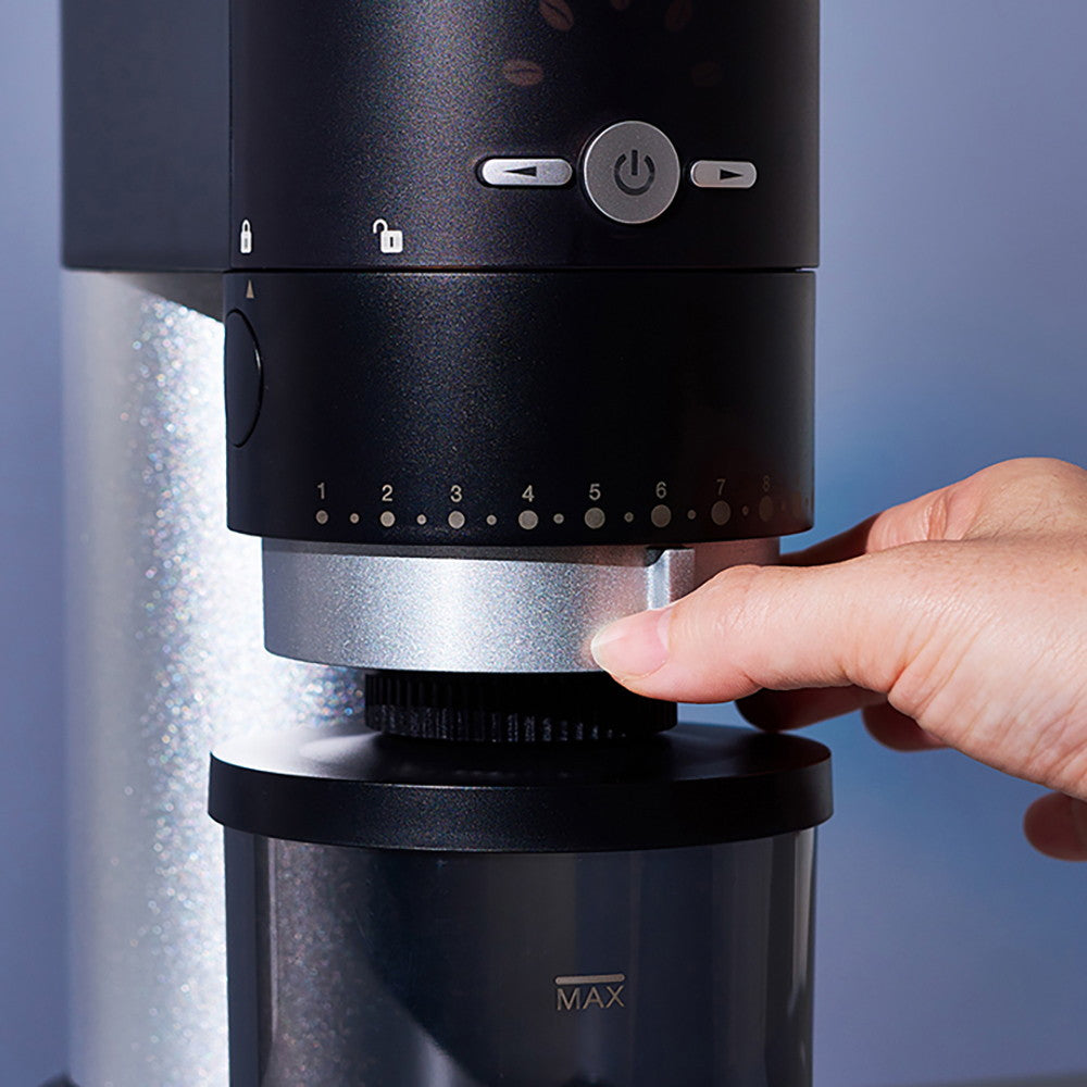 粒度は極細挽き~粗挽きまで無段階設定で、様々な飲み方に合わせて、細やかな調節が可能です。