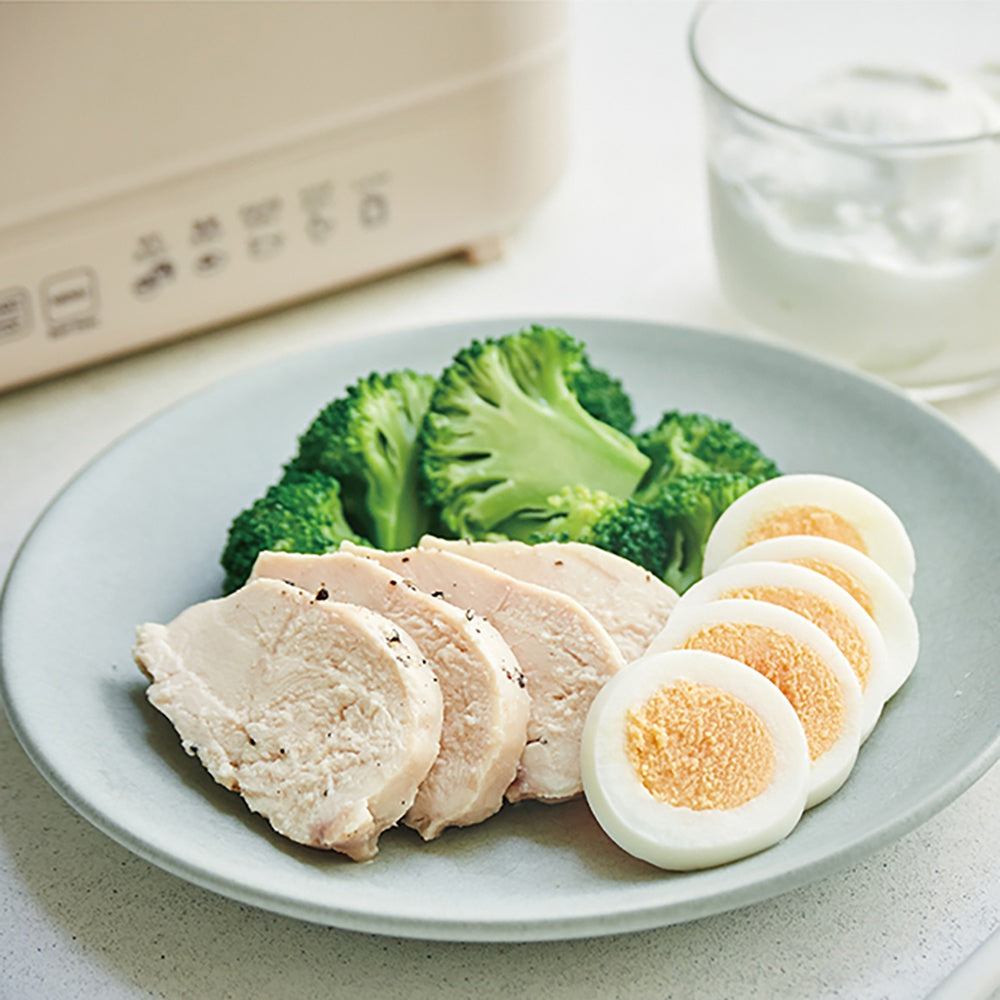 [エッグ&ボイルクッカー]なら、ゆでたまごや温泉たまご、レトルトの湯せんがほったらかしで簡単に!さらに、低温調理で作るサラダチキンやぷるぷる食感のたまご料理が作れるメニューも搭載。専用の[カゴ]にセットして水を注いだら、調理メニューを選ぶだけで、時間も温度もすべておまかせ。あとはできあがりを楽しみに待つだけ。